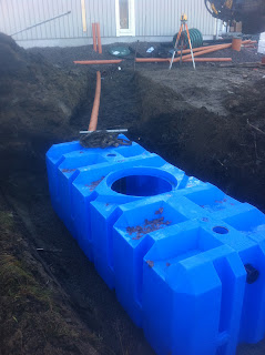 Förra veckan grävde Peter och grävaren Gerle ner vår 3-kammarbrunn och pissetank. Jag har bilderna. Nu ska ni få se...